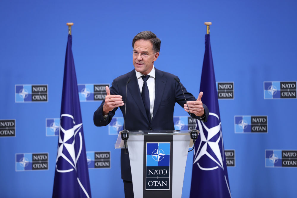 10月1日,在位于比利时布鲁塞尔的北约总部,北约新一任秘书长马克·吕特在新闻发布会上讲话。新华社记者赵丁喆摄